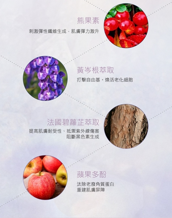 配合天然熊果素及黃芩精華,3重淨白,排解黑色素,擊退斑點痘印,均勻膚色